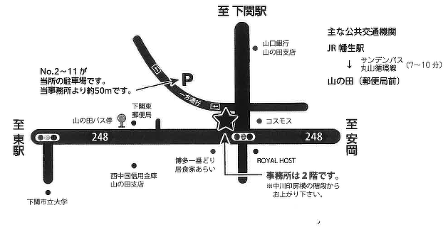 県道246号線からは、山の田交差点を武久方面に曲がり、「山の田製菓」からすぐ降りた右手に焼鳥屋「串の坊」を目印に進んでください。一方通行の下り道(事務所が入っているビルの裏手)を50メートルほど進んだ場所の右手に駐車場があります。