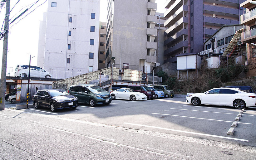 「山の田青果」からすぐ降りた右手に焼鳥屋「串の坊」を目印に進んでください。一方通行の下り道(事務所が入っているビルの裏手)を50メートルほど進んだ場所の右手に駐車場があります。